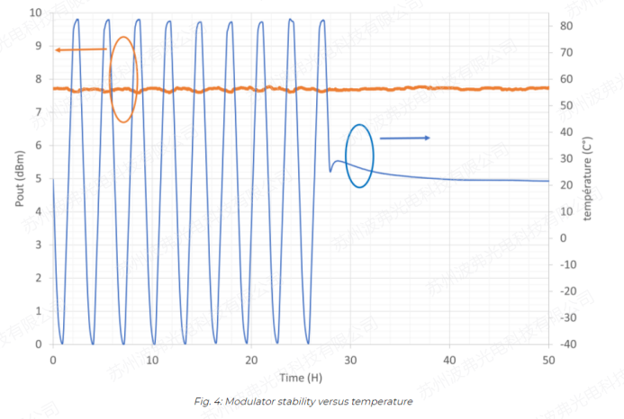 由于激光系统可能需要在户外和具有挑战性的环境中工作,因此对调制器进行了长时间温度循环测试。温度(蓝色曲线)从-40°C到+85°C,并记录输出功率(橙色曲线)。通过我们的特殊调制器工艺,调制器是非常稳定的,我们只观察到在整个温度范围内0,2dB的微小变化。
