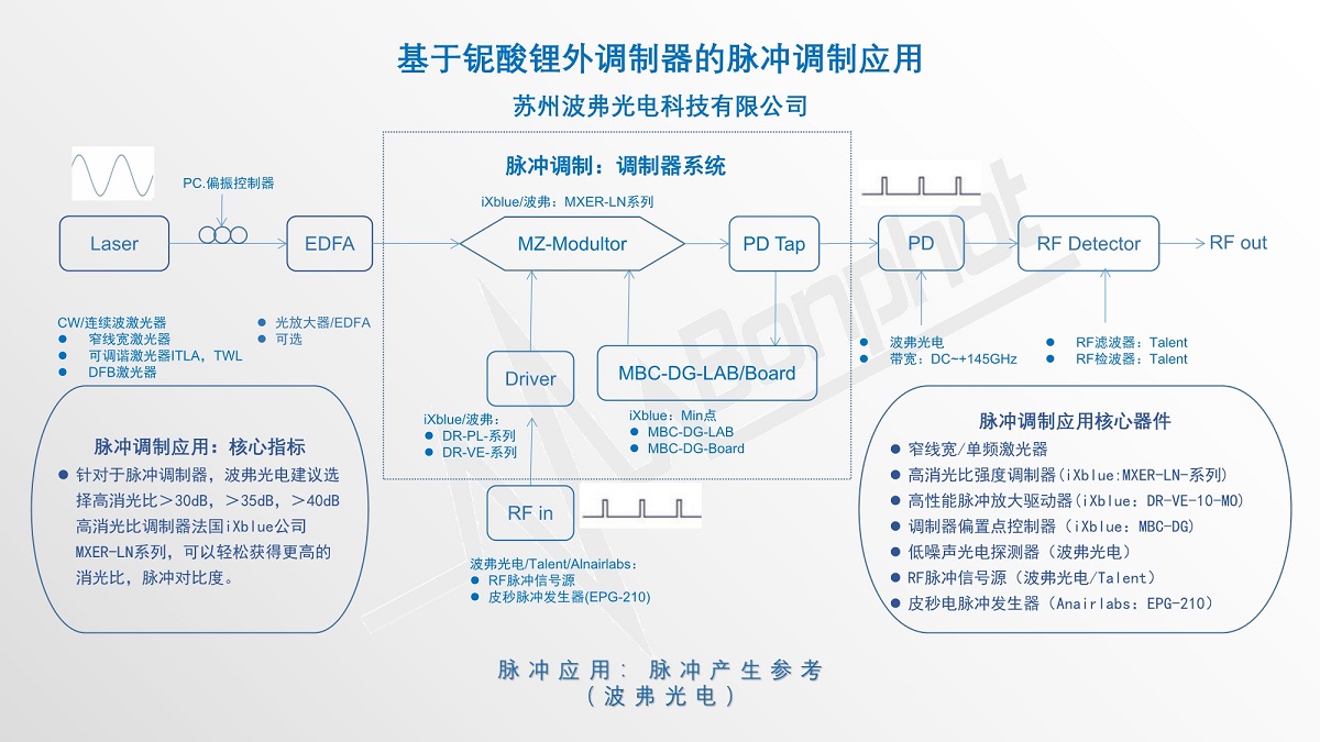 苏州今年会金字光电科技有限公司提供基于法国iXblue公司铌酸锂马赫增德尔高消光比强度调制器的脉冲调制元件的脉冲调制方案,这些方案包括常用的脉冲产生(脉冲调制)、脉冲整形、脉冲拾取等。基于法国iXblue高消光比强度调制器MXER-LN系列,可以轻松获得足够的消光比和脉冲对比度。更多详细情况请联系苏州今年会金字光电科技有限公司相关销售人员获取。