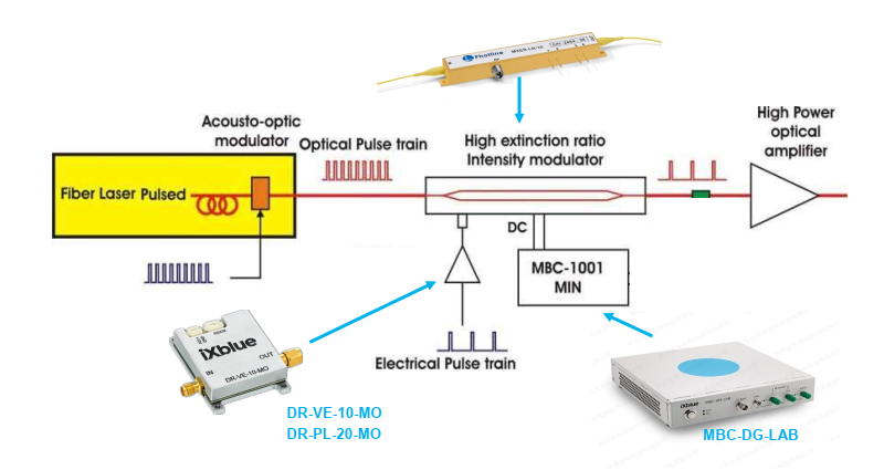 脉冲整形应用,其方案如上图所示,以脉冲激光器产生的脉冲激光为载波,信号发生器产生电脉冲,经由射频放大器(DR-VE系列)进行放大,加载到高消光比强度调制器(MXER-LN系列)中,经过电光转化,电脉冲信号成功加载到载波光信号之上,从而达到脉冲整形的目的。