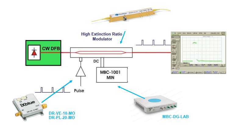 直流偏压点的漂移可以使用iXblue的MBC(调制器自动偏压控制器)解决方案进行主动监测和控制:台式仪器MBC-DG-LAB或MBC-DG-board锁定用于脉冲应用的Mach-Zehnder调制器的工作点。