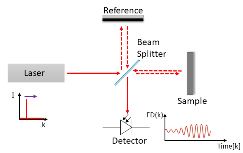 图1:相干探测示意图:波长可调激光器被分割为参考,再次组合的样本/场景及其与光电探测器的检测,由数字化仪和快速傅立叶变换获取,得出距离(+速度)