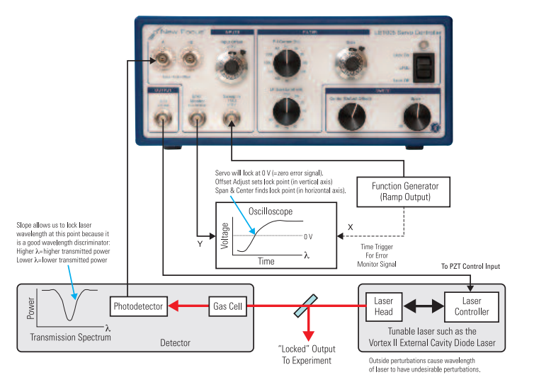 New Focus LB1005高速伺服控制器为执行反馈控制提供了关键的信号处理电子设备。 在波长锁定的情况下,误差信号是通过将一部分激光输出传输通过波长参考(例如气室或标准具)而产生的。 任何波长的不稳定性都会被转换为可以被光电探测器检测到的振幅电荷。 由此产生的误差信号由LB1005伺服控制器过滤,形成一个控制信号,发送回激光器。 (图1)