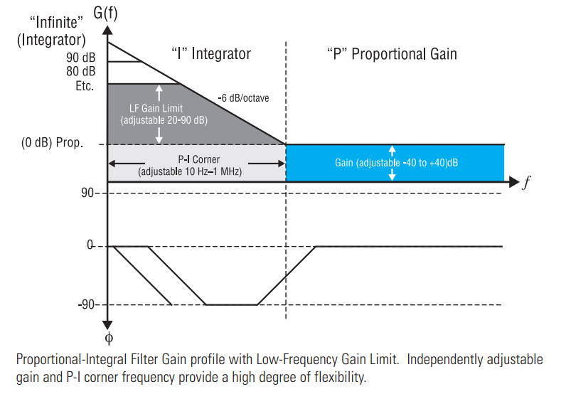 LB1005伺服控制器由模拟电子处理的三个阶段组成:输入阶段、滤波器阶段和输出阶段。 (图2)过滤阶段是最重要的,因为它设置系统的行为。 用户控制影响系统稳定性的三个重要滤波器参数,以及实际输出与所需值的匹配程度(P-I角、比例增益和低频增益限制)。