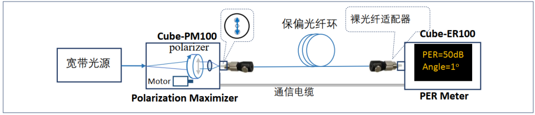 在测量保偏器件的偏振消光比(PER)时 ,较低的光源线偏振度 ,以及线偏振光与保偏光纤光轴之间的对轴角度偏差是PER测量误差的主要来源。为了最大限度的消除这两种测量误差源, 本公司自豪地推出了业界首个自动化偏振消光比测量系统。